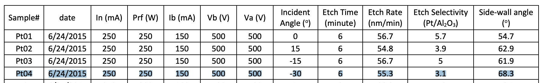 Highlighted here is the closest to 90° sidewall, highest etch rate for the hardest material I have data, Pt. Should be a good starting point. Then can try some variations like adding CF4 (which creates volatile NbF products).